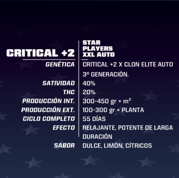 Critical + 2 XXL Auto es una gran genética para tu colección e ideal para compartir una rica comida, una tarde de risas con amigos o un buen libro.