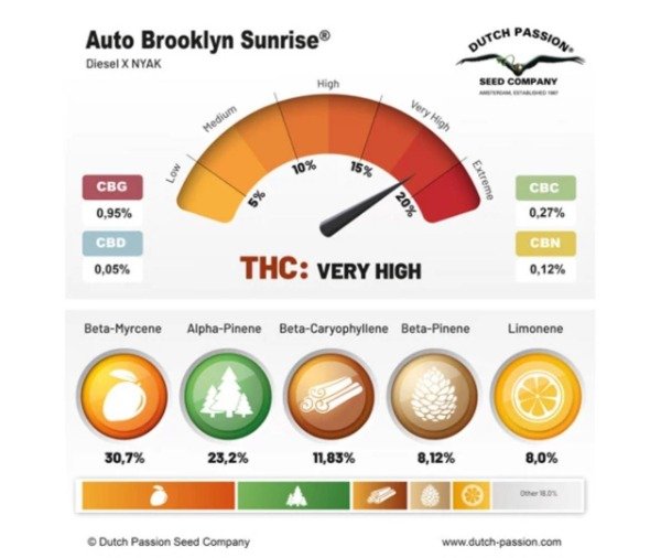 Auto Brooklyn Sunrise es una autofloreciente feminizada de dominancia balanceada (≈50/50 indica – sativa) que combina genética de Brooklyn Diesel (clon East Coast) con élites de AK-47 provenientes del estado de Nueva YorK.