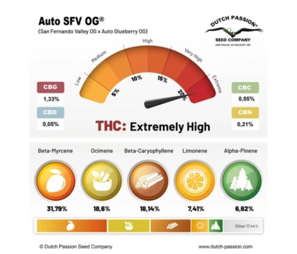 . Terpenos principales: Mirceno, pinene, terpinoleno (perfil complejo y penetrante)