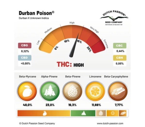 • Genética: 100 % sativa pura (landrace originaria de Durban, Sudáfrica), nunca híbrida.