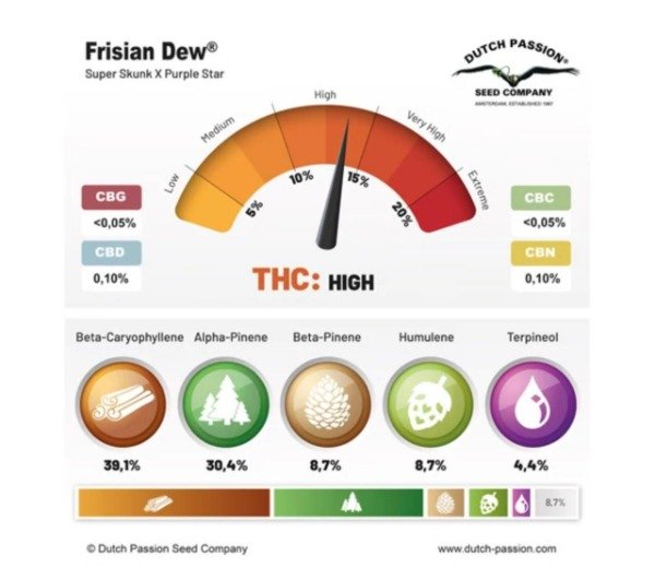 Frisian Dew es un híbrido equilibrado (50 % índica / 50 % sativa) resultado del cruzamiento entre Super Skunk y Purple Star, madurado tras años de selección de clones . Especialmente valorada para cultivo outdoor, es muy resistente a climas adversos, incluyendo humedad y temperaturas bajas. Desarrolla tonos púrpura claros durante la floración, diferenciándose visualmente.