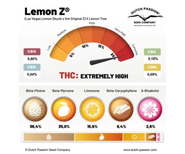 • Lemon Z es una variedad femenizada fotoperódica, resultado del cruce entre (Las Vegas Lemon Skunk × Original Z) × Lemon Tree, mejorando una genética ganadora del HighLife Cup 2018 (mejor sativa y weed del show).
