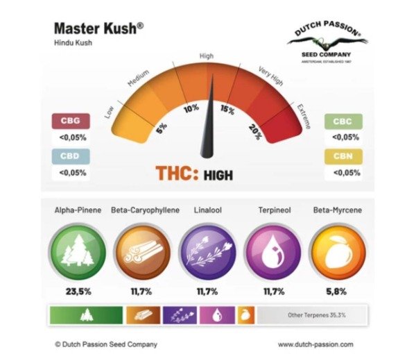 Master Kush® es una clásica variedad dominante índica, originaria de la región Hindu Kush de Afganistán y adaptada por Dutch Passion como línea feminizada estable y confiable. Se hizo famosa por su estructura compacta, sus cogollos duros y resinosos, sabor Kush auténtico y un perfil terpénico terroso con toques cítricos sutiles.