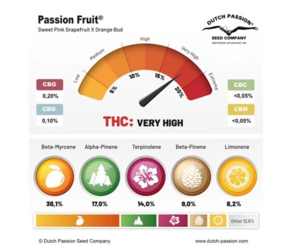 Passion Fruit es un híbrido equilibrado (aproximadamente 50 % índica / 50 % sativa) obtenido al cruzar Sweet Pink Grapefruit con Orange Bud. Destaca por ser una de las variedades más afrutas que ofrece Dutch Passion, con aroma y sabor intensamente cítricos y dulces. Produce cogollos densos cubiertos de resina y muy pegajosos en la floración tardía.