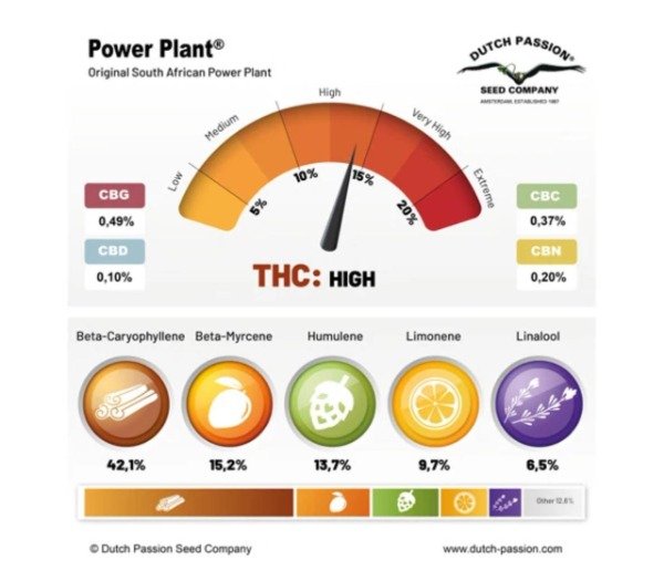 Power Plant es una sativa fotoperiódica feminizada clásica de Dutch Passion, originada a partir de genética sativa sudafricana de alta potencia. Es muy apreciada por su floración rápida (aproximadamente 8 semanas), facilidad de cultivo y altos rendimientos.